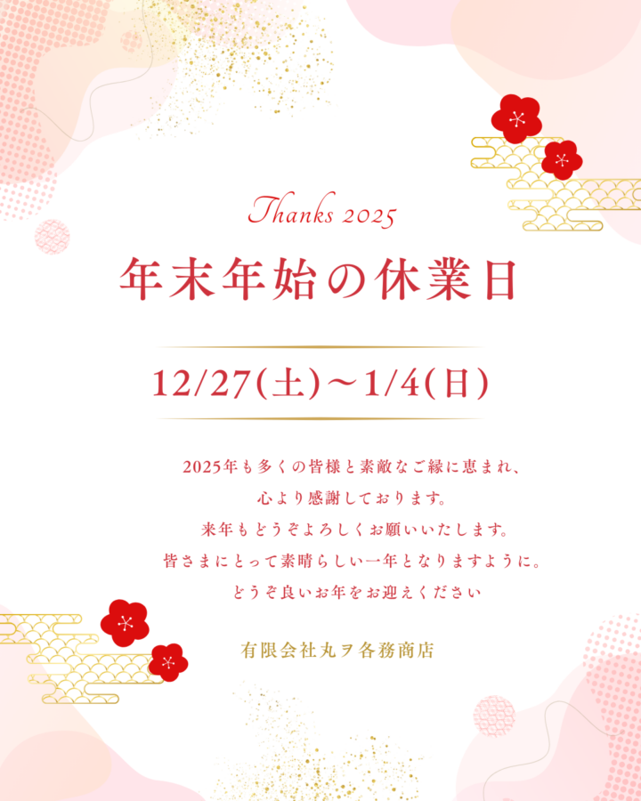 年末年始のお知らせ 2025年12月23日 年末年始休業のご案内 日頃より弊社ホームページをご覧いただき、誠にありがとうございます。誠に勝手ながら、下記の期間を年末年始休業とさせていただきます。 【休業期間】2025年12月27日(土)~2026年1月4日(日) 休業期間中にいただいたご連絡・お問い合わせにつきましては、1月5日(月)営業再開後、順次ご対応させていただきます。 本年も多くのご縁をいただき、心より感謝申し上げます。来年もどうぞよろしくお願いいたします。 アマゾン情報 インフォメーション エトセトラ お知らせ ブログ 年末年始、ご挨拶、お知らせ、丸ヲ各務商店、HP、ホームページ、 ツイート シェア はてブ pocket LINE CERASTA2025 11.7~11.9 前へ 一覧へ 次へ おすすめ関連記事 「お誕生日会」ケーキプレゼント 2024年12月03日 年末年始休業のお知らせ 2024年12月27日 「き業展」ベストブース賞受賞いたしました 2025年02月06日 Palasol 横須賀店 × タイルストーリー 2025年09月08日